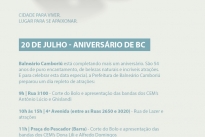 A programação começa às 9h, com o primeiro corte do bolo na Rua 3100 e apresentação das Bandas Escolares dos CEM's Antônio Lúcio e Armando Cesar Ghislandi. O bolo, que está sendo produzido pelo curso de gastronomia da Faculdade Avantis, terá 54 metros de comprimento. Com recheio de creme de doce de leite com coco, o bolo será decorado pela frase "EU ♥ BC", flores frescas, macarons (doce colorido de origem francesa) e frutas frescas e será distribuído em 2300 fatias em embalagens plásticas.