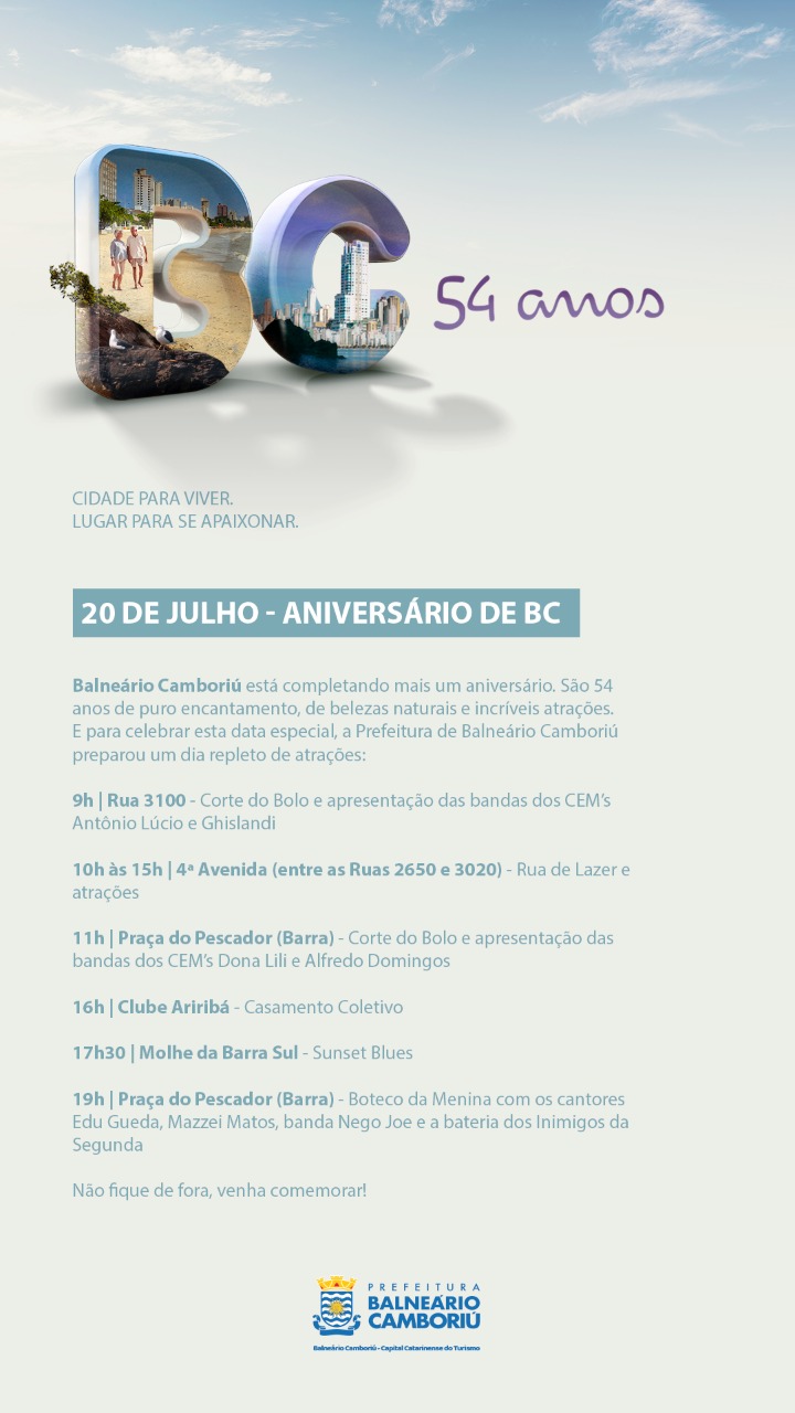 Na próxima sexta-feira (20), Balneário Camboriú completa 54 anos. E para comemorar esta data especial, vai ter festa durante todo o dia. "Vamos comemorar 54 anos de muito trabalho e de muito sucesso. Balneário Camboriú conseguiu transformar suas belezas naturais em riqueza e em desenvolvimento através da força empreendedora e da hospitalidade das pessoas que são daqui e também daquelas que escolheram viver aqui. Por isso, a programação de aniversário foi pensada com muito carinho para celebrarmos a data com toda a população", disse o prefeito, Fabrício Oliveira.