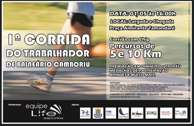 A 1ª Corrida do Trabalhador é uma promoção da Associação Cultural Social Desportiva e Eventos - Life Esportes e tem o apoio da Prefeitura Municipal de Balneário Camboriú, Secretaria de Turismo e Desenvolvimento Econômico – Sectur, Fundação Municipal de Esportes – FME, Secretaria de Segurança Pública –SSP/Agentes de Trânsito e Kolizeu Sports.