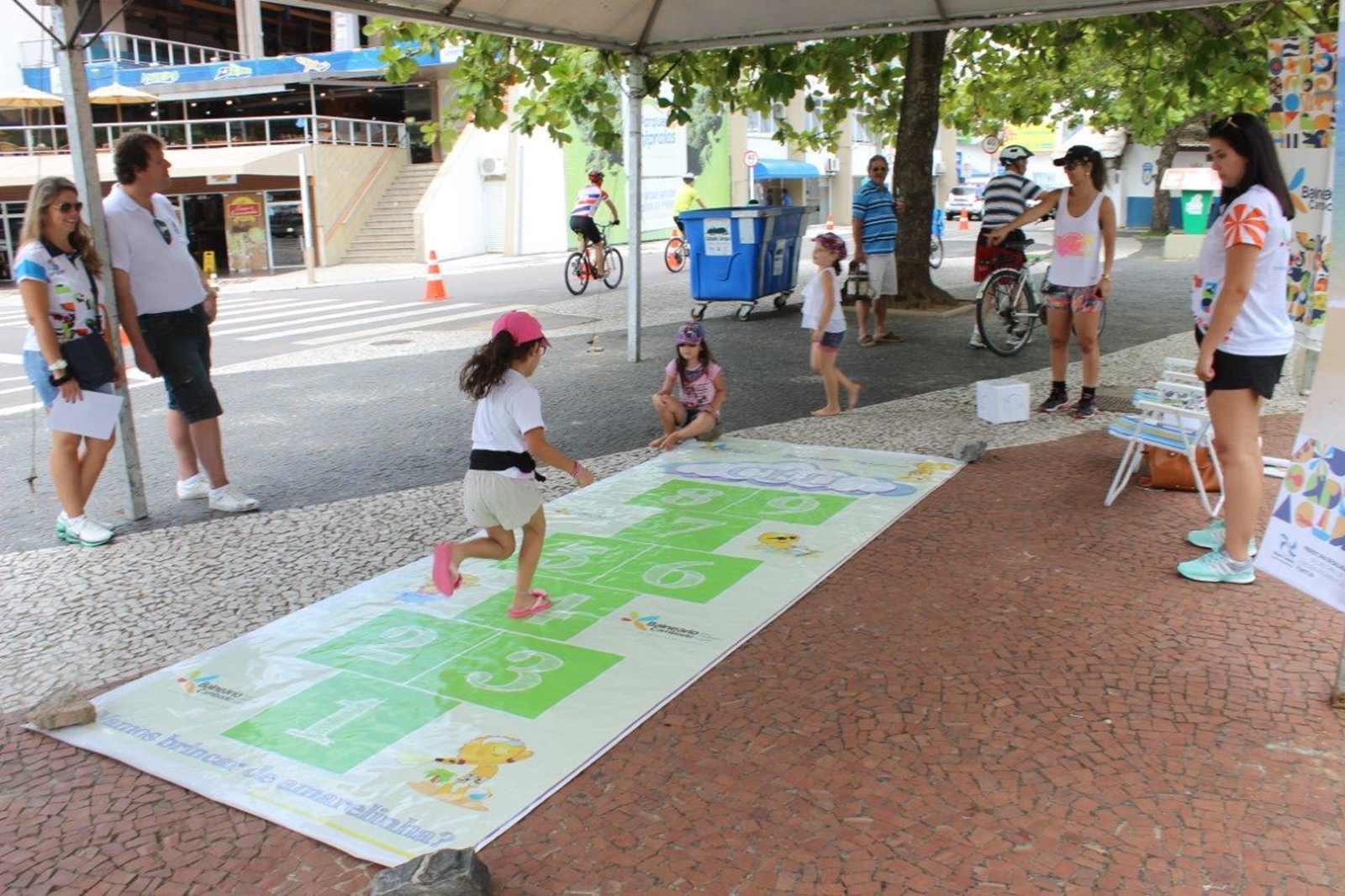 A moradora Daniela Serpa Macedo e o marido Ricardo mostraram ao filho Enzo, de apenas 2 anos, como pular amarelinha, que era a brincadeira turística oferecida pela Secretaria de Turismo, no Atlântica Ativa. "Eu moro em Balneário Camboriú, e acredito que do ponto de vista de um turista, é uma cidade que está muito bem equipada, principalmente pela infraestrutura e gastronomia. A gente é mal acostumado, pois aqui somos muito bem atendidos, o que nem sempre acontece em outros destinos turísticos", destacou Daniela, que aproveita a geografia plana local e as ciclovias criadas nos últimos anos para pedalar muito na sua bicicleta. "Pode-se fazer tudo de bike aqui", elogia.