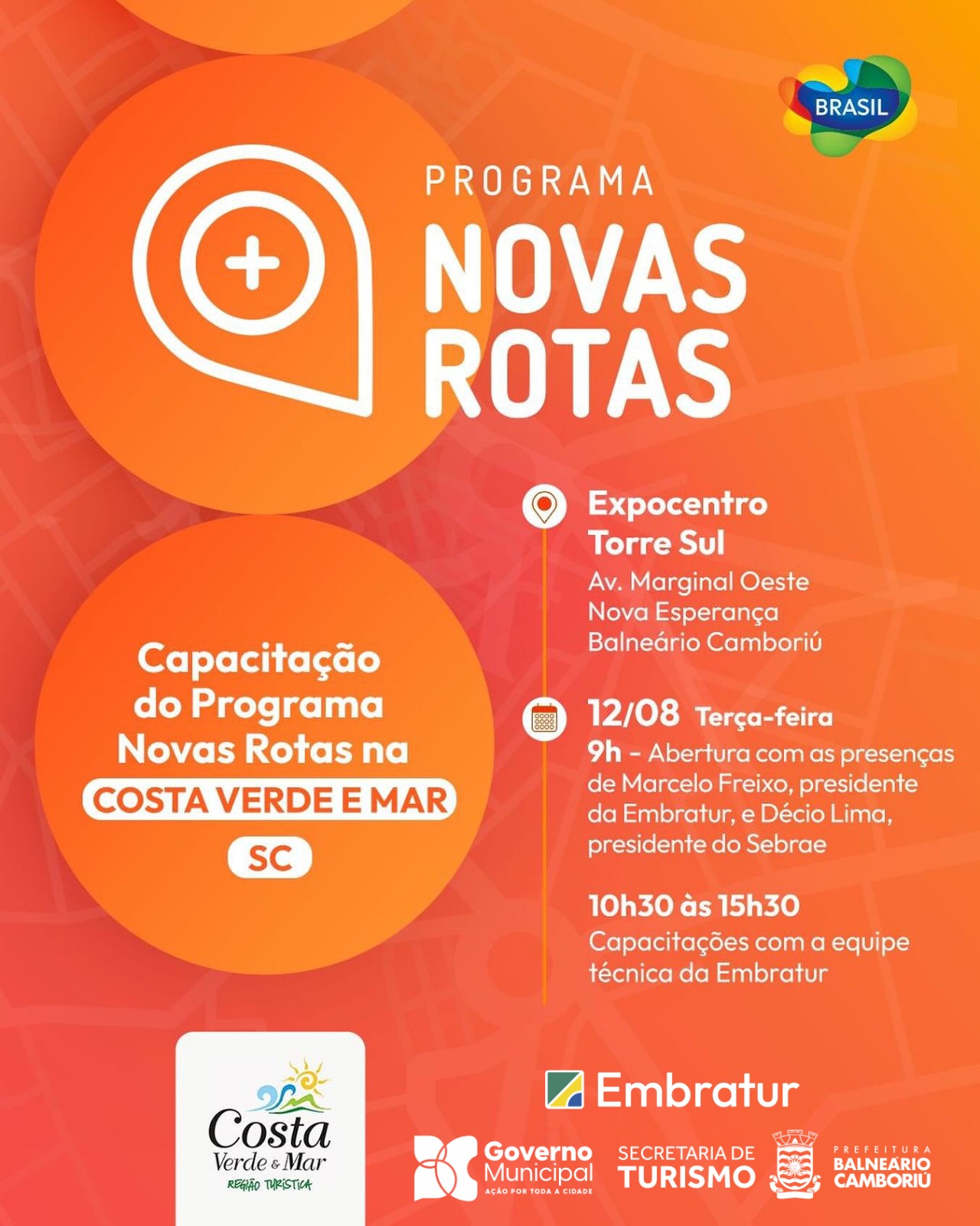 A partir das 9h desta terça-feira (12), no Expocentro Balneário Camboriú, a Agência Brasileira de Promoção Internacional do Turismo (Embratur) dará início ao projeto Novas Rotas em Santa Catarina. A ação é promovida também em outros destinos e Balneário Camboriú foi o escolhido para sediar a primeira rodada de capacitação no estado.