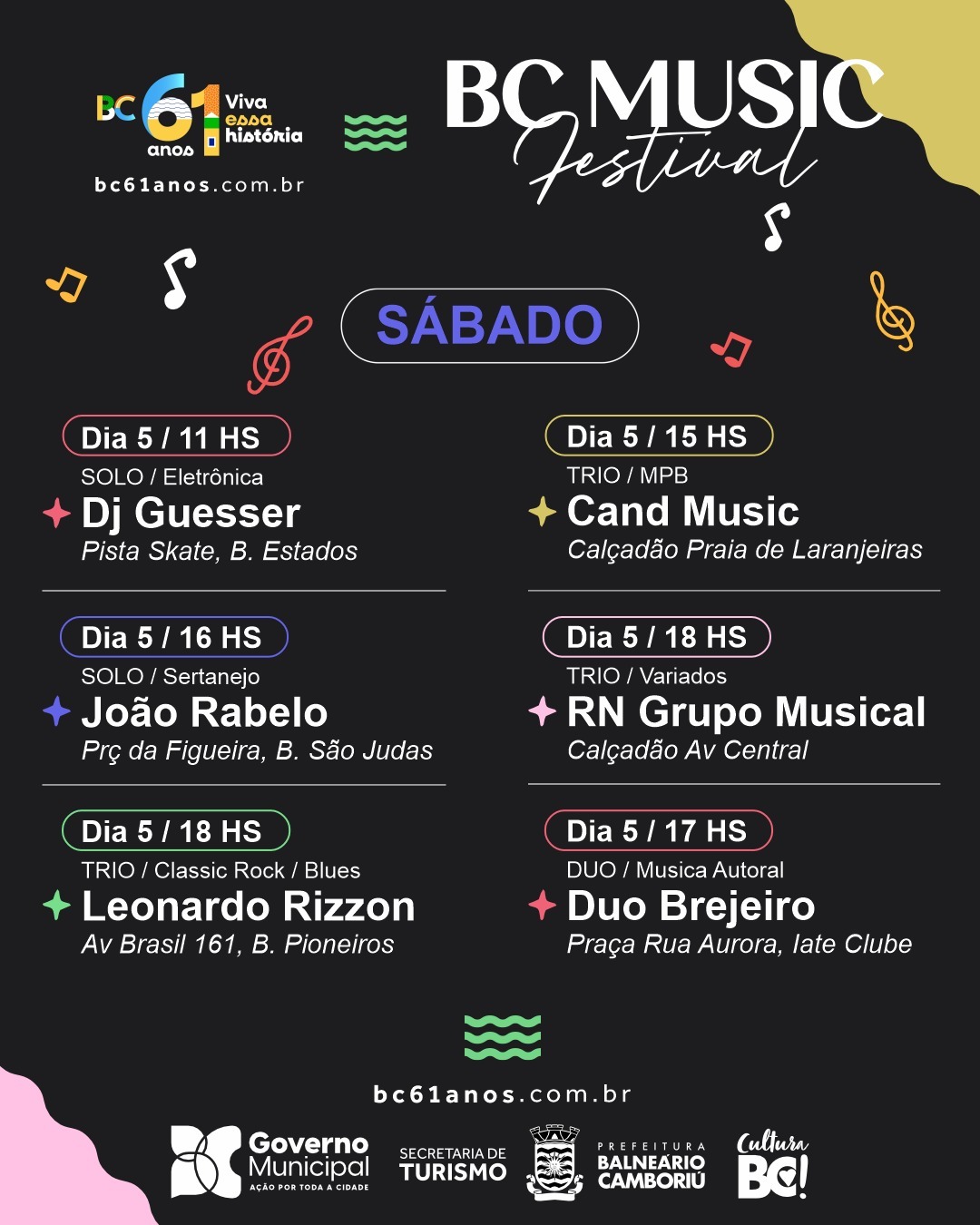 Para este sábado (5) e domingo (6), primeiro fim de semana de julho, o BC Music Festival terá 14 apresentações, em nove bairros de Balneário Camboriú. A iniciativa faz parte da programação oficial de aniversário de 61 anos do município e é organizada pela Prefeitura Municipal por meio da Secretaria de Turismo.