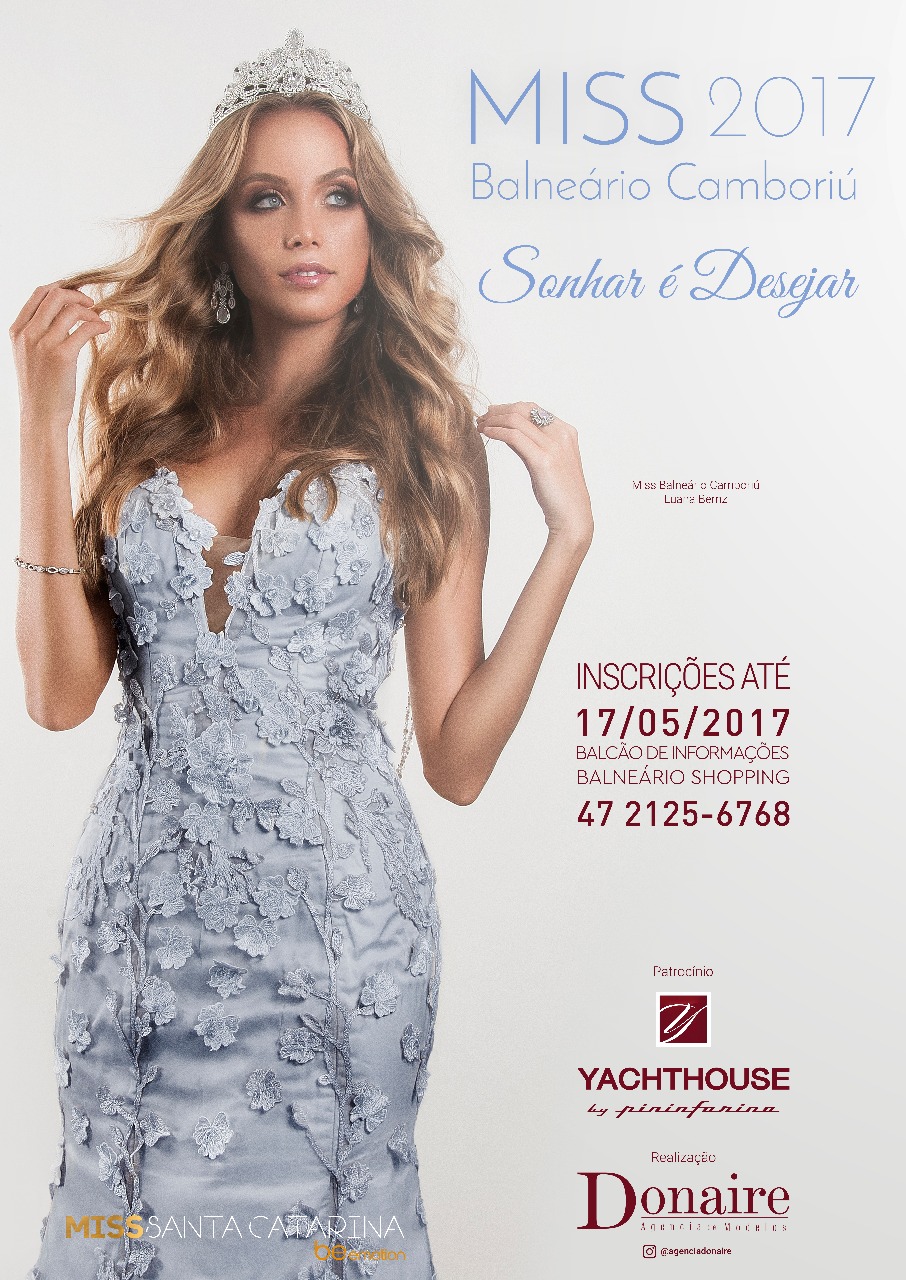 As inscrições para o Miss Balneário Camboriú 2017 estão abertas até 17 de maio, no Balneário Shopping. O regulamento do concurso está disponível no site http://www.misssantacatarinaoficial.com.br.