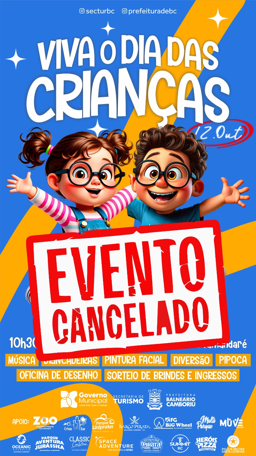 A Prefeitura de Balneário Camboriú, por meio da Secretaria de Turismo, informa que o desfile de mascotes que ocorreria no próximo domingo (12) na Avenida Atlântica, em alusão ao Dia das Crianças, foi cancelado por causa da previsão meteorológica que indica chuva nesta data em Balneário Camboriú. O evento ocorreria em parceria com os atrativos turísticos do município.