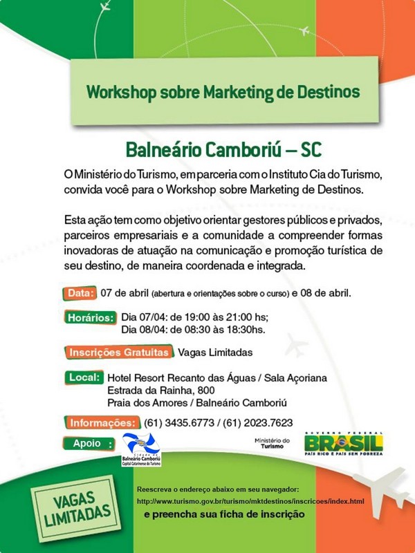 Os profissionais do trade do turismo, interessados em receber capacitação em Marketing de Destinos, curso oferecido pelo Ministério do Turismo em parceria com a Cia do Turismo, em Balneário Camboriú nos próximos dias 7 e 8, ainda tem chance para se inscrever. O Workshop acontece no hotel Recanto das Águas, das 19 às 21 horas de quinta, e das 8h30 às 18h30 de sexta-feira.
