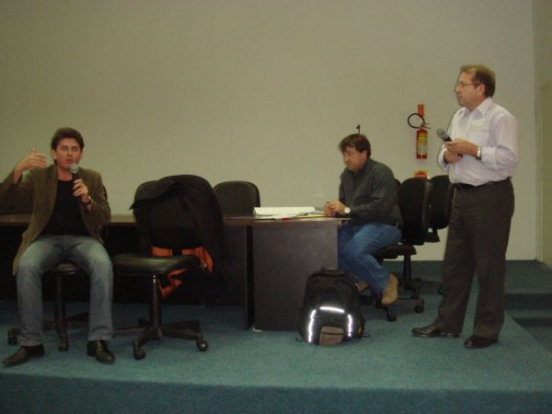 Na foto, o secretário Ademar realizando palestrana SOL. Ao lado, Flávio Agustini e Valdir Walendowsky