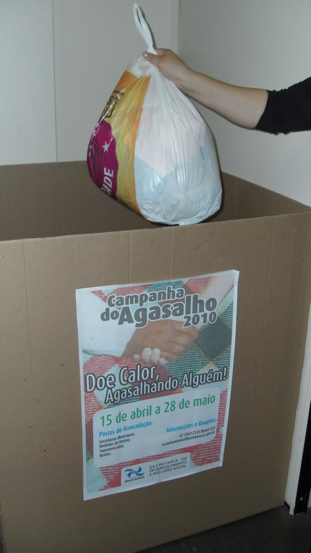 Lançada pela Secretaria de Desenvolvimento e Inclusão Social no dia 15 de abril, a Campanha do Agasalho 2010 - Doe Calor Agasalhando Alguém conta com a ajuda de diversos parceiros e com mais de 20 pontos de arrecadação das doações. Até o momento, 876 pessoas foram cadastradas para receber as roupas. As famílias que ainda não se inscreveram tem até o dia 28 para fazer o cadastramento na própria Secretaria de Inclusão Social. Mais informações através do telefone (47) 3363-2745.