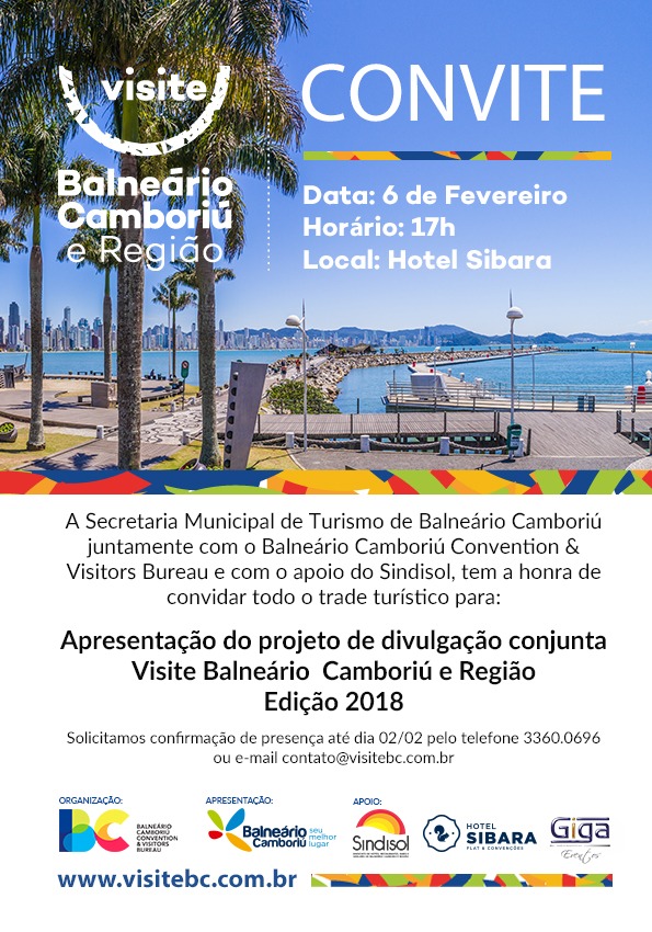 Na próxima terça-feira (06), a Secretaria de Turismo e Desenvolvimento Econômico, juntamente com o Balneário Camboriú Convention & Visitors Bureau, apresentará o projeto de divulgação edição de 2018, do Visite BC e Região. Todo o trade turístico foi convidado para conhecer o projeto, a partir das 17h, no Hotel Sibara.